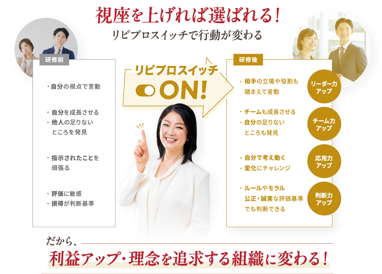 リピプロ®研修では中小企業の戦略をベースに、お客様に比べられて選ばれる思考と行動を体得。個人力だけでなく仲間を巻き込み動かす力も同時に身に着けることで「リピート受注によって成果を出し続ける組織へと変革する」目的達成型組織を創るための研修です。
